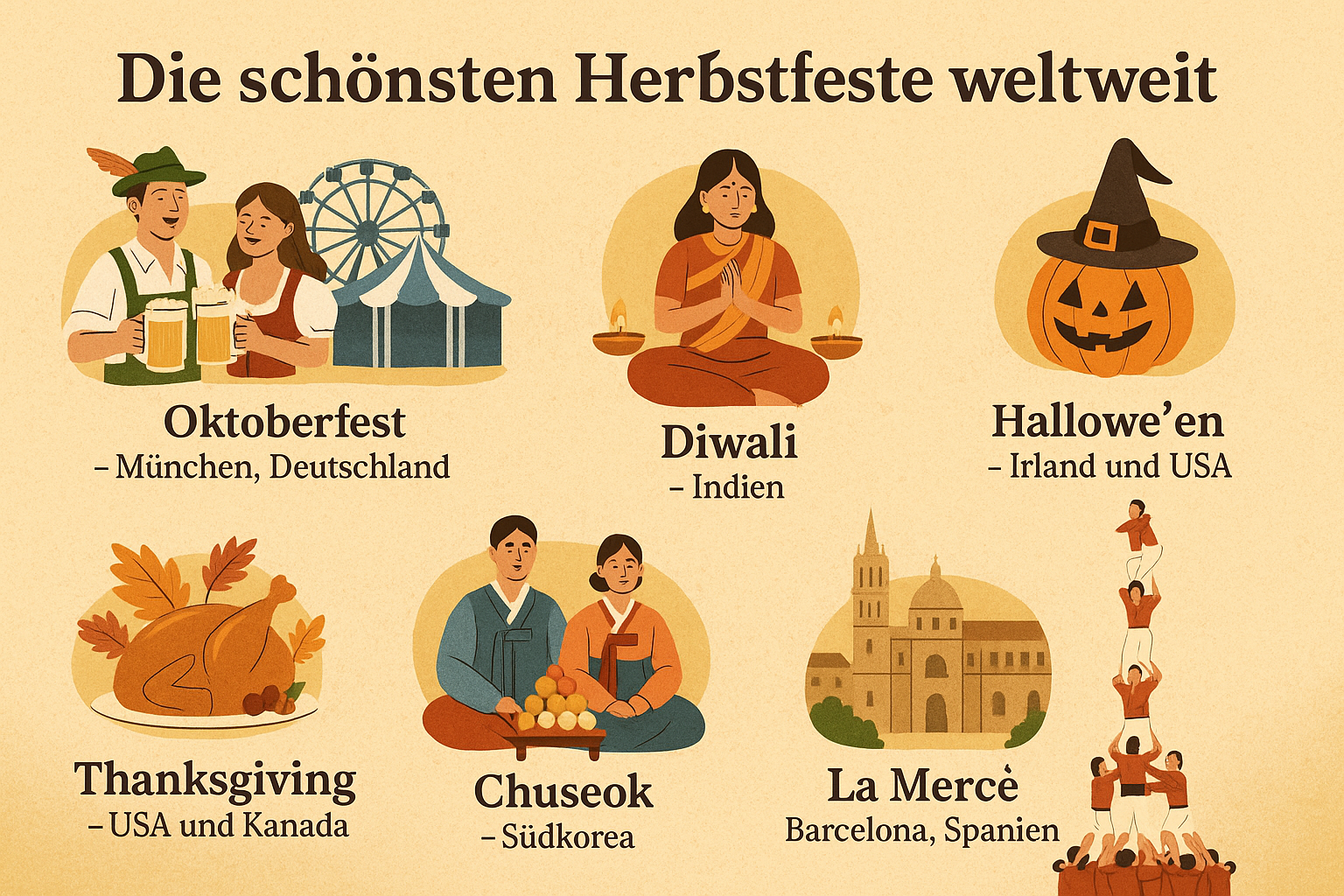 Der Herbst ist weltweit ein Monat voller bedeutender und beeindruckender Feste. Ob es nun das Oktoberfest in Deutschland, das Lichterfest Diwali in Indien oder das Erntedankfest Chuseok in Südkorea ist, jedes dieser Feste spiegelt die Kultur und Traditionen des Landes wider und bietet eine einzigartige Gelegenheit, den Herbst auf besondere Weise zu feiern. Diese Feste verbinden Menschen, schaffen Erinnerungen und zelebrieren die Schönheit des Herbstes auf verschiedenste Arten.